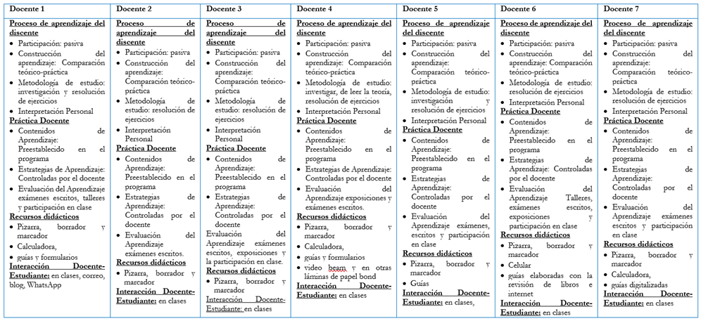 Posteriormente, se aplicó una entrevista a los docentes previamente observados, basado en una guía de entrevista y grabador que facilitó la captura de los puntos de vista de los informantes claves. Esto permitió la implementación del método de estudio de casos etnográfico, enfocados en las prácticas didácticas de un grupo de profesores y específicamente orientando el análisis hacia las teorías de aprendizaje en las que basan su praxis. La interpretación de datos recabados se inició con un ejercicio de reducción semántica del contenido de las respuestas de los entrevistados, a partir de la categorización como fase fundamental; y finalmente se realizó el proceso de triangulación con la vinculación de las teorías del Aprendizaje según Schunk (2012), y la información obtenida mediante la observación directa y las entrevistas.