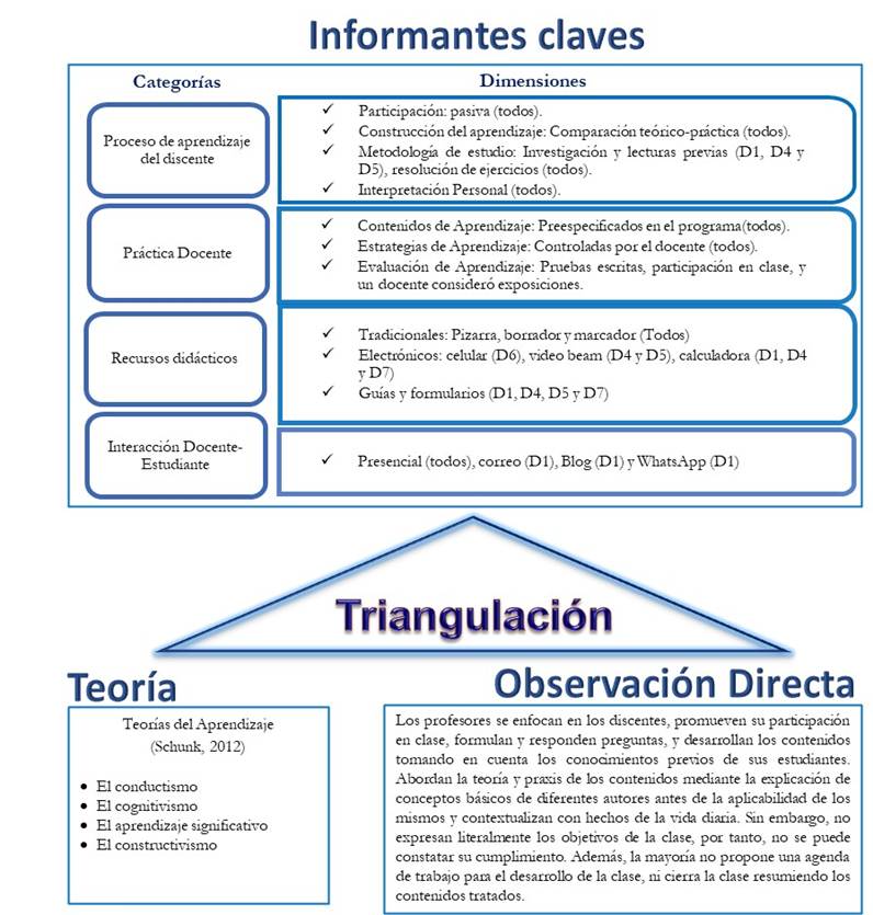 El proceso de triangulación, se realizó haciendo uso de varios métodos, por un lado, se encuentran las teorías del Aprendizaje según Schunk (2012), por el otro extremo, se agrega una síntesis de los resultados obtenidos mediante observación directa en las clases y en la parte superior de presentan las categorías y subcategorías generadas con la información proporcionada por los docentes entrevistados (ver figura 3). Conviene resaltar, que se constata la existencia de ciertas diferencias en el acto didáctico, específicamente en las opiniones de los entrevistados se percibe un quehacer pedagógico fundamentado en la teoría del conductismo, pero durante en las aulas de clases se observa que hay ciertos elementos del constructivismo que son tomados en cuenta al desarrollar los procesos de enseñanza y aprendizaje.