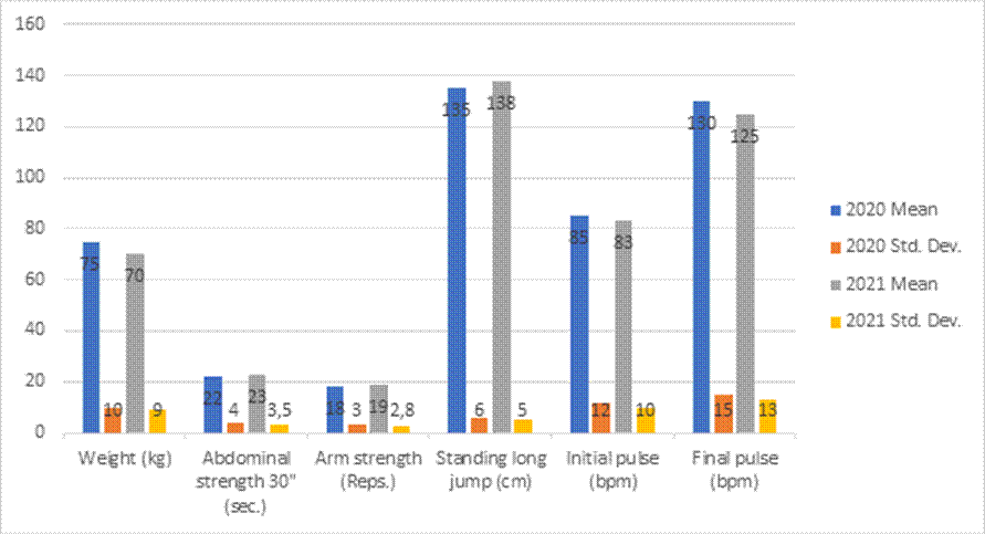 Graph No. 1. Comparison of physical performance indicators in 2020 and 2021. Note. Prepared by the authors based on the results obtained in the 2020 and 2021 academic years.