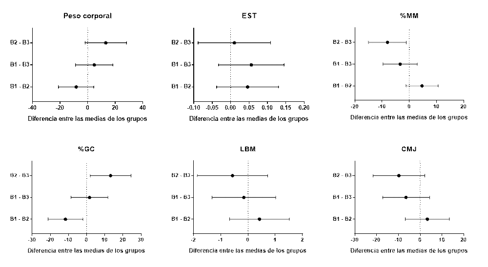 En la Figura 1 se presentan las diferencias entre las medias de las distintas clases deportivas en variables de composición corporal y pruebas de rendimiento físico. No se observaron diferencias significativas en las variables antropométricas de peso corporal y estatura entre las categorías evaluadas. En cuanto a la composición corporal, los atletas clasificados en la categoría B2 mostraron un porcentaje de grasa corporal (%GC) significativamente mayor en comparación con los atletas de la categoría B1 (p= 0,0145) y B3 (p= 0,0179). Por otro lado, los atletas de la categoría B3 presentaron un porcentaje de masa muscular (%MM) significativamente superior en comparación con los de la categoría B2 (p= 0,0207).