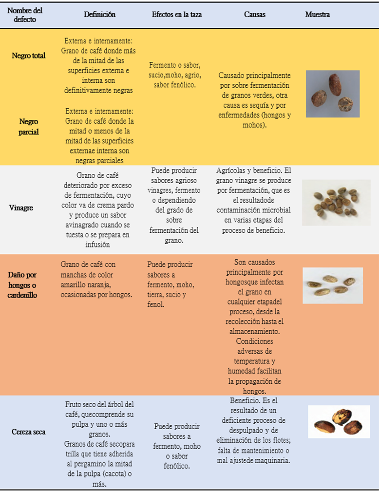 La calidad física del café se determina mediante un examen visual que evalúa los defectos del grano verde y su aspecto general. Los granos que presentan defectos físicos, como los mencionados en la tabla, son descartados por completo. Se considera café de buena calidad física aquel que tiene una mayor proporción de granos sanos en pergamino.