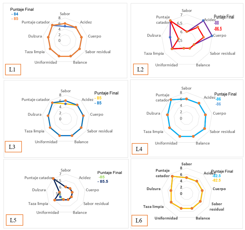 Figura 5. Características Organolépticas del café según clasificación y valoración de intervalo que se realizó en la empresa ARABICA COFFEE CAFETERIA SOCIEDAD ANÓNIMA CERRADA (SAC). Números de lotes: L1, L2, L3, L4, L5, L6.